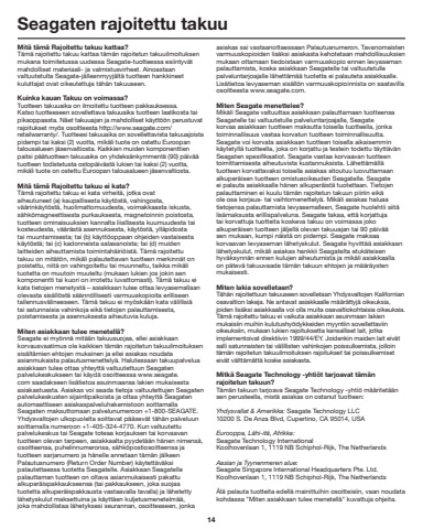 14Seagaten rajoitettu takuu Mit%u00e4 t%u00e4m%u00e4 Rajoitettu takuu kattaa? T%u00e4m%u00e4 rajoitettu takuu kattaa t%u00e4m%u00e4n rajoitetun takuuilmoituksen mukana toimitetussa uudessa Seagate-tuotteessa esiintyv%u00e4t mahdolliset materiaali- ja valmistusvirheet. Ainoastaan valtuutetulta Seagate-j%u00e4lleenmyyj%u00e4lt%u00e4 tuotteen hankkineet kuluttajat ovat oikeutettuja t%u00e4h%u00e4n takuuseen.Kuinka kauan Takuu on voimassa? Tuotteen takuuaika on ilmoitettu tuotteen pakkauksessa.Katso tuotteeseen sovellettava takuuaika tuotteen laatikosta tai pikaoppaasta. N%u00e4et takuuajan ja mahdolliset k%u00e4ytt%u00f6%u00f6n perustuvat rajoitukset my%u00f6s osoitteesta http://www.seagate.com/retailwarranty/. Tuotteesi takuuaika on sovellettavista takuuajoista pidempi tai kaksi (2) vuotta, mik%u00e4li tuote on ostettu Euroopan talousalueen j%u00e4senvaltiosta. Kaikkien muiden komponenttien paitsi p%u00e4%u00e4tuotteen takuuaika on yhdeks%u00e4nkymment%u00e4 (90) p%u00e4iv%u00e4%u00e4 tuotteen todistetusta ostop%u00e4iv%u00e4st%u00e4 lukien tai kaksi (2) vuotta, mik%u00e4li tuote on ostettu Euroopan talousalueen j%u00e4senvaltiosta.Mit%u00e4 t%u00e4m%u00e4 Rajoitettu takuu ei kata? T%u00e4m%u00e4 rajoitettu takuu ei kata virheit%u00e4, jotka ovat aiheutuneet (a) kaupallisesta k%u00e4yt%u00f6st%u00e4, vahingosta, v%u00e4%u00e4rink%u00e4yt%u00f6st%u00e4, huolimattomuudesta, voimakkaasta iskusta, s%u00e4hk%u00f6magneettisesta purkauksesta, magnetoinnin poistosta, tuotteen ominaisuuksien kannalta liiallisesta kuumuudesta tai kosteudesta, v%u00e4%u00e4r%u00e4st%u00e4 asennuksesta, k%u00e4yt%u00f6st%u00e4, yll%u00e4pidosta tai muuntamisesta; tai (b) k%u00e4ytt%u00f6oppaan ohjeiden vastaisesta k%u00e4yt%u00f6st%u00e4; tai (c) kadonneista salasanoista; tai (d) muiden laitteiden aiheuttamista toimintah%u00e4iri%u00f6ist%u00e4. T%u00e4m%u00e4 rajoitettu takuu on mit%u00e4t%u00f6n, mik%u00e4li palautettavan tuotteen merkinn%u00e4t on poistettu, niit%u00e4 on vahingoitettu tai muunneltu, taikka mik%u00e4li tuotetta on muutoin muuteltu (mukaan lukien jos jokin sen komponentti tai kuori on irrotettu luvattomasti). T%u00e4m%u00e4 takuu ei kata tietojen menetyst%u00e4 %u2013 asiakkaan tulee ottaa levyasemallaan olevasta sis%u00e4ll%u00f6st%u00e4 s%u00e4%u00e4nn%u00f6llisesti varmuuskopioita erilliseen tallennusv%u00e4lineeseen. T%u00e4m%u00e4 takuu ei my%u00f6sk%u00e4%u00e4n kata v%u00e4lillisi%u00e4 tai satunnaisia vahinkoja eik%u00e4 tietojen palauttamisesta, poistamisesta ja asennuksesta aiheutuvia kuluja. Miten asiakkaan tulee menetell%u00e4? Seagate ei my%u00f6nn%u00e4 mit%u00e4%u00e4n takuusuojaa, ellei asiakkaan korvausvaatimus ole kaikkien t%u00e4m%u00e4n rajoitetun takuuilmoituksen sis%u00e4lt%u00e4mien ehtojen mukainen ja ellei asiakas noudata asianmukaista palautusmenettely%u00e4. Halutessaan takuupalvelua asiakkaan tulee ottaa yhteytt%u00e4 valtuutettuun Seagaten palvelukeskukseen tai k%u00e4yd%u00e4 osoitteessa www.seagate.com saadakseen lis%u00e4tietoa asuinmaansa lakien mukaisesta asiakastuesta. Asiakas voi saada tietoja valtuutettujen Seagaten palvelukeskusten sijaintipaikoista ja ottaa yhteytt%u00e4 Seagaten automaattiseen asiakaspalveluhakemistoon soittamalla Seagaten maksuttomaan palvelunumeroon +1-800-SEAGATE.Yhdysvaltojen ulkopuolelta soittavat p%u00e4%u00e4sev%u00e4t t%u00e4h%u00e4n palveluun soittamalla numeroon +1-405-324-4770. Kun valtuutettu palvelukeskus tai Seagate toteaa korjauksen tai korvaavan tuotteen olevan tarpeen, asiakkaalta pyydet%u00e4%u00e4n h%u00e4nen nimens%u00e4, osoitteensa, puhelinnumeronsa, s%u00e4hk%u00f6postiosoitteensa ja tuotteen sarjanumero ja h%u00e4nelle annetaan t%u00e4m%u00e4n j%u00e4lkeen Palautusnumero (Return Order Number) k%u00e4ytett%u00e4v%u00e4ksi palautettaessa tuotetta Seagatelle. Asiakkaan Seagatelle palauttaman tuotteen on oltava asianmukaisesti pakattu alkuper%u00e4ispakkaukseensa (tai pakkaukseen, joka suojaa tuotetta alkuper%u00e4ispakkausta vastaavalla tavalla) ja l%u00e4hetetty l%u00e4hetyskulut maksettuina ja k%u00e4ytt%u00e4en kuljetusmenetelm%u00e4%u00e4, joka mahdollistaa l%u00e4hetyksesi seurannan, osoitteeseen, jonka asiakas sai vastaanottaessaan Palautusnumeron. Tavanomaisten varmuuskopioiden lis%u00e4ksi asiakasta kehotetaan mahdollisuuksien mukaan ottamaan tiedoistaan varmuuskopio ennen levyaseman palauttamista, koska asiakkaan Seagatelle tai valtuutetulle palveluntarjoajalle l%u00e4hett%u00e4m%u00e4%u00e4 tuotetta ei palauteta asiakkaalle.Lis%u00e4tietoa levyaseman sis%u00e4ll%u00f6n varmuuskopioinnista on saatavilla osoitteesta www.seagate.com.Miten Seagate menettelee? Mik%u00e4li Seagate valtuuttaa asiakkaan palauttamaan tuotteensa Seagatelle tai valtuutetulle palveluntarjoajalle, Seagate korvaa asiakkaan tuotteen maksutta toisella tuotteella, jonka toiminnallisuus vastaa korvatun tuotteen toiminnallisuutta.Seagate voi korvata asiakkaan tuotteen toisella aikaisemmin k%u00e4ytetyll%u00e4 tuotteella, joka on korjattu ja testein todettu t%u00e4ytt%u00e4v%u00e4n Seagaten spesifikaatiot. Seagate vastaa korvaavan tuotteen toimittamisesta aiheutuvista kustannuksista. L%u00e4hett%u00e4m%u00e4ll%u00e4 tuotteen korvattavaksi toisella asiakas sitoutuu luovuttamaan alkuper%u00e4isen tuotteen omistusoikeuden Seagatelle. Seagate ei palauta asiakkaalle h%u00e4nen alkuper%u00e4ist%u00e4 tuotettaan. Tietojen palauttaminen ei kuulu t%u00e4m%u00e4n rajoitetun takuun piiriin eik%u00e4 ole osa korjaus- tai vaihtomenettely%u00e4. Mik%u00e4li asiakas haluaa tietojensa palauttamista levyasemalleen, Seagate huolehtii siit%u00e4 lis%u00e4maksusta erillispalveluna. Seagate takaa, ett%u00e4 korjattuja tai korvattuja tuotteita koskeva takuu on voimassa joko alkuper%u00e4isen tuotteen j%u00e4ljell%u00e4 olevan takuuajan tai 90 p%u00e4iv%u00e4%u00e4 sen mukaan, kumpi n%u00e4ist%u00e4 on pidempi. Seagate maksaa korvaavan levyaseman l%u00e4hetyskulut. Seagate hyvitt%u00e4%u00e4 asiakkaan l%u00e4hetyskulut, mik%u00e4li asiakas hankkii Seagatelta etuk%u00e4te