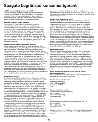 15Seagate begr%u00e4nsad konsumentgarantiVad t%u00e4cker denna begr%u00e4nsade garanti?Den h%u00e4r begr%u00e4nsade garantin t%u00e4cker alla brister vad avser material och utf%u00f6rande f%u00f6r den medf%u00f6ljande nya Seagateprodukten. Den h%u00e4r begr%u00e4nsade garantin g%u00e4ller endast konsumenter som k%u00f6per den medf%u00f6ljande produkten fr%u00e5n en auktoriserad Seagate-%u00e5terf%u00f6rs%u00e4ljare eller detaljist.Hur l%u00e5ng tid g%u00e4ller denna garanti?Garantitiden f%u00f6r produkten %u00e4r den tid som anges p%u00e5 f%u00f6rpackningen. Se f%u00f6rpackningen eller snabbstartguiden f%u00f6r den garantitid som %u00e4r till%u00e4mplig f%u00f6r din produkt. Du kan ocks%u00e5 g%u00e5 till http://www.seagate.com/retailwarranty/ f%u00f6r att f%u00e5 tiden f%u00f6r din garantiperiod och avg%u00f6ra om det finns n%u00e5gra anv%u00e4ndar begr%u00e4nsande villkor. Om produkten har k%u00f6pts i en medlemsstat tillh%u00f6rande den Europeiska unionen erh%u00e5ller du en l%u00e4ngre garantiperiod om tv%u00e5 (2) %u00e5r Garantiperioden f%u00f6r alla komponeneter f%u00f6rutom huvudprodukten %u00e4r nittio (90) dagar fr%u00e5n ink%u00f6psdatum eller tv%u00e5 (2) %u00e5r om produkten %u00e4r ink%u00f6pt inom den Europeiska unionen.Vad t%u00e4cker inte denna begr%u00e4nsade garanti?Denna garanti t%u00e4cker inte n%u00e5gra fel som har orsakats av (a) kommersiellt bruk, olycka, ol%u00e4mplig anv%u00e4ndning, f%u00f6rsummelse, st%u00f6t, elektrostatisk urladdning, avmagnetisering hetta eller fukt ut%u00f6ver det som anges i produktspecifikationerna, felaktig installation, anv%u00e4ndning, sk%u00f6tsel eller modifiering; eller (b) felaktig anv%u00e4ndning som inte %u00f6verensst%u00e4mmer med instruktionerna i anv%u00e4ndarmanualen; eller (c) f%u00f6rlorade l%u00f6senord; eller (d) funktionsoduglighet som orsakats av annan utrustning. Denna begr%u00e4nsade garanti %u00e4r ogiltig om en produkt returneras med borttagen, skadad eller manipulerad etikett eller n%u00e5gra %u00e4ndringar (inklusive oauktoriserat borttagande av komponent eller yttre h%u00f6lje). Den h%u00e4r begr%u00e4nsade garantin t%u00e4cker inte f%u00f6rlust av data %u2013 s%u00e4kerhetskopiera regelbundet inneh%u00e5llet p%u00e5 din disk till en separat medium som kan spara informationen. Dessutom, indirekta skador; f%u00f6ljdskador; och kostnader som har samband med %u00e5terst%u00e4llande av data, databorttagande, och datainstallation %u00e4r inte ers%u00e4ttningsbara under denna garanti.Vad beh%u00f6ver du g%u00f6ra?Om du inte genomf%u00f6r din reklamation i enlighet med samtliga instruktioner i denna begr%u00e4nsade garanti samt f%u00f6ljer det korrekta f%u00f6rfarandet f%u00f6r returnerande av produkten kommer Seagate inte att infria sin begr%u00e4nsade garanti. Kontakta ett auktoriserat Seagate service center f%u00f6r att beg%u00e4ra tj%u00e4nster enligt garantin eller bes%u00f6k www.seagate.com f%u00f6r att f%u00e5 mer information om kundsupport inom din jurisdiktion. Du kan ocks%u00e5 f%u00e5 information om var ett auktoriserat Seagate service center ligger samt f%u00e5 tillg%u00e5ng till Seagates automatiska kundservice katalog genom att ringa +1-800-SEAGATE. Kunder som inte ringer fr%u00e5n USA kan f%u00e5 tillg%u00e5ng till denna service genom att ringa +1-405-324-4770.N%u00e4r ett auktoriserat service center eller Seagate beslutar att en reparation eller ett utbyte %u00e4r n%u00f6dv%u00e4ndigt kommer du att bli ombedd att uppge namn, adress, telefonnummer, e-postadress och produktens serienummer och d%u00e4refter erh%u00e5lla ett Return Order Number att anv%u00e4nda vid returnerande av produkten till Seagate. Produkter som returneras till Seagate m%u00e5ste vara riktigt f%u00f6rpackade i produktens originalf%u00f6rpackning (eller i en f%u00f6rpackning som skyddar produkten p%u00e5 ett likv%u00e4rdigt s%u00e4tt) och skickade, med kostnaden f%u00f6r f%u00f6rs%u00e4ndelsen betald i f%u00f6rskott, via ett frakts%u00e4tt som g%u00f6r det m%u00f6jligt att sp%u00e5ra din f%u00f6rs%u00e4ndelse, till den adress du erh%u00f6ll n%u00e4r du mottog ditt Return Order Number.Ut%u00f6ver dina ordinarie s%u00e4kerhetskopieringar b%u00f6r du, om m%u00f6jligt, s%u00e4kerhetskopiera dina data innan du returnerar disken eftersom produkten du skickar till Seagate eller till en auktoriserad serviceleverant%u00f6r inte kommer att bli skickad tillbaka till dig. Mer information om s%u00e4kerhetskopiering av inneh%u00e5llet p%u00e5 din disk finns p%u00e5 www.seagate.com.Vad kommer Seagate att g%u00f6ra? Om Seagate godk%u00e4nner att du skickar tillbaka produkten till Seagate eller till en auktoriserad serviceleverant%u00f6r, kommer Seagate att byta ut din produkt mot en likv%u00e4rdig fungerande ers%u00e4ttningsprodukt utan kostnad. Seagate kan ers%u00e4tta din produkt med en produkt som tidigare har varit anv%u00e4nd men som reparerats och testats f%u00f6r att m%u00f6ta Seagates krav. Seagate kommer att betala f%u00f6r f%u00f6rs%u00e4ndelsen av utbytesprodukten till dig. Genom att s%u00e4nda din produkt f%u00f6r utbyte accepterar du att din %u00e4gander%u00e4tt till originalprodukten %u00f6verg%u00e5r till Seagate.Seagate kommer inte att skicka tillbaka originalprodukten till dig.%u00c5terst%u00e4llande av data omfattas inte av denna begr%u00e4nsade garanti och %u00e4r inte del av reparations- eller utbytesprocessen. Om du vill att data %u00e5terst%u00e4lls fr%u00e5n din disk kan detta genomf%u00f6ras av Seagate som en separat till%u00e4ggstj%u00e4nst mot extra kostnad. De reparerade eller utbytta produkterna t%u00e4cks av den garantitid som %u00e4r l%u00e4ngst av den %u00e5terst%u00e5ende garantitiden eller 90 dagar.Hur till%u00e4mpas lagen? P%u00e5 denna begr%u00e4nsade garanti skall lagen i den amerikanska delstaten Kalifornien i USA till%u00e4mpas. Den ger dig specifika juridiska r%u00e4ttigheter men du kan ocks%u00e5 ha andra r%u00e4ttigheter som g%u00e4ller fr%u00e5n delstat till delstat. Denna begr%u00e4nsade garanti p%u00e5verk