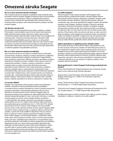 16Omezen%u00e1 z%u00e1ruka SeagateNa co se tato omezen%u00e1 z%u00e1ruka vztahuje?Tato omezen%u00e1 z%u00e1ruka se vztahuje na jak%u00e9koliv vady materi%u00e1lu nebo proveden%u00ed nov%u00e9ho v%u00fdrobku Seagate, ke kter%u00e9mu bylo toto prohl%u00e1%u0161en%u00ed o omezen%u00e9 z%u00e1ruce p%u0159ipojeno. Pln%u011bn%u00ed na z%u00e1klad%u011b t%u00e9to omezen%u00e9 z%u00e1ruky mohou z%u00edskat pouze spot%u0159ebitel%u00e9, kte%u0159%u00ed v%u00fdrobek koup%u00ed od autorizovan%u00e9ho prodejce nebo maloobchodn%u00edho prodejce v%u00fdrobk%u016f zna%u010dek Seagate.Jak dlouho z%u00e1ruka trv%u00e1?Z%u00e1ru%u010dn%u00ed doba na tento produkt trv%u00e1 po dobu uvedenou v balen%u00ed. Prostudujte si obal produktu nebo stru%u010dn%u00fd n%u00e1vod, kde naleznete d%u00e9lku p%u0159%u00edslu%u0161n%u00e9 z%u00e1ru%u010dn%u00ed doby. Informace o d%u00e9lce z%u00e1ru%u010dn%u00ed doby a omezen%u00ed pou%u017e%u00edv%u00e1n%u00ed naleznete tak%u00e9 na adrese http://www.seagate.com/retailwarranty/. Pokud jste produkt zakoupili v %u010dlensk%u00e9m st%u00e1t%u011b Evropsk%u00e9ho hospod%u00e1%u0159sk%u00e9ho prostoru, bude se na v%u00e1%u0161 produkt vztahovat p%u0159%u00edslu%u0161n%u00e1 del%u0161%u00ed z%u00e1ru%u010dn%u00ed doba nebo dva roky. Z%u00e1ru%u010dn%u00ed doba na v%u0161echny sou%u010d%u00e1sti krom%u011b hlavn%u00edho produktu je devades%u00e1t dn%u00ed od dolo%u017een%u00e9ho data koup%u011b nebo dva roky, pokud se koup%u011b uskute%u010dnila ve st%u00e1t%u011b Evropsk%u00e9ho hospod%u00e1%u0159sk%u00e9ho prostoru.Na co se tato omezen%u00e1 z%u00e1ruka nevztahuje?Tato omezen%u00e1 z%u00e1ruka se nevztahuje na p%u0159%u00edpad, kter%u00fd je zp%u016fsoben (a) komer%u010dn%u00edm u%u017e%u00edv%u00e1n%u00edm, nehodou, hrub%u00fdm zach%u00e1zen%u00edm, nedbalost%u00ed, n%u00e1razem, elektrostatick%u00fdm v%u00fdbojem, kompenzac%u00ed magnetick%u00e9ho pole, p%u016fsoben%u00edm tepla nebo vlhkosti nad r%u00e1mec specifikace v%u00fdrobku, nespr%u00e1vnou instalac%u00ed, provozem, %u00fadr%u017ebou nebo %u00fapravou nebo (b) nespr%u00e1vn%u00fdm pou%u017eit%u00edm v rozporu s pokyny uveden%u00fdmi v n%u00e1vodu k pou%u017eit%u00ed nebo (c) ztr%u00e1tou hesel nebo (d) funk%u010dn%u00ed poruchou zp%u016fsobenou jin%u00fdm za%u0159%u00edzen%u00edm. Tato omezen%u00e1 z%u00e1ruka je neplatn%u00e1, pokud je v%u00fdrobek vr%u00e1cen s odstran%u011bn%u00fdmi, po%u0161kozen%u00fdmi nebo zm%u011bn%u011bn%u00fdmi %u0161t%u00edtky nebo jin%u00fdmi %u00fapravami (v%u010detn%u011b odstran%u011bn%u00ed jak%u00e9koliv sou%u010d%u00e1sti nebo vn%u011bj%u0161%u00edho krytu). Tato omezen%u00e1 z%u00e1ruka se nevztahuje na ztr%u00e1tu dat %u2013 pravideln%u011b z%u00e1lohujte obsah sv%u00e9ho pevn%u00e9ho disku na z%u00e1lo%u017en%u00ed m%u00e9dium. Tato z%u00e1ruka nekryje ani n%u00e1sledn%u00e9 nebo nahodil%u00e9 %u0161kody a n%u00e1klady vynalo%u017een%u00e9 na obnovu, odstran%u011bn%u00ed a instalaci dat.Co mus%u00edte ud%u011blat?Seagate v%u00e1m neposkytne z%u00e1ru%u010dn%u00ed pln%u011bn%u00ed, pokud va%u0161e reklamace nebude v souladu se v%u0161emi podm%u00ednkami tohoto prohl%u00e1%u0161en%u00ed o omezen%u00e9 z%u00e1ruce a pokud nebudete p%u0159i vr%u00e1cen%u00ed v%u00fdrobku postupovat spr%u00e1vn%u00fdm zp%u016fsobem. Pokud budete po%u017eadovat z%u00e1ru%u010dn%u00ed servis, obra%u0165te se na autorizovan%u00e9 servisn%u00ed centrum Seagate nebo na internetov%u00e9 str%u00e1nky www.seagate.com, kde z%u00edsk%u00e1te dal%u0161%u00ed informace ohledn%u011b z%u00e1kaznick%u00e9 podpory v r%u00e1mci va%u0161%u00ed zem%u011b. Informace o um%u00edst%u011bn%u00ed autorizovan%u00fdch servisn%u00edch center Seagate z%u00edsk%u00e1te na telefonu +1-800-SEAGATE, kde z%u00edsk%u00e1te i p%u0159%u00edstup k automatick%u00e9mu adres%u00e1%u0159i z%u00e1kaznick%u00e9ho servisu. Pro volaj%u00edc%u00ed mimo Spojen%u00e9 st%u00e1ty americk%u00e9 je tato slu%u017eba dostupn%u00e1 na telefonn%u00edm %u010d%u00edsle +1-405-324-4770. Jakmile autorizovan%u00e9 servisn%u00ed centrum nebo Seagate ur%u010d%u00ed, %u017ee je pot%u0159eba prov%u00e9st opravu nebo n%u00e1hradu, budete vyzv%u00e1ni, abyste Seagate sd%u011blili sv%u00e9 jm%u00e9no, adresu, telefonn%u00ed %u010d%u00edslo, e-mailovou adresu a s%u00e9riov%u00e9 %u010d%u00edslo v%u00fdrobku, a pot%u00e9 v%u00e1m bude p%u0159id%u011bleno Objednac%u00ed %u010d%u00edslo pro vr%u00e1cen%u00ed, kter%u00e9 se u%u017e%u00edv%u00e1 p%u0159i vr%u00e1cen%u00ed v%u00fdrobku spole%u010dnosti Seagate. V%u00fdrobek, kter%u00fd vr%u00e1t%u00edte Seagate, mus%u00ed b%u00fdt %u0159%u00e1dn%u011b zabalen v origin%u00e1ln%u00edm obalu (nebo obalu, kter%u00fd poskytne v%u00fdrobku stejnou ochranu jako p%u016fvodn%u00ed obal) a doru%u010den s p%u0159edplacen%u00fdm po%u0161tovn%u00fdm, a to zp%u016fsobem, kter%u00fd umo%u017e%u0148uje sledov%u00e1n%u00ed va%u0161%u00ed z%u00e1silky, na adresu poskytnutou p%u0159i p%u0159id%u011blen%u00ed Objednac%u00edho %u010d%u00edsla pro vr%u00e1cen%u00ed. Mimo pravideln%u00e9 z%u00e1lohov%u00e1n%u00ed dat z%u00e1lohujte sv%u00e1 data, pokud to bude mo%u017en%u00e9, p%u0159ed odesl%u00e1n%u00edm va%u0161eho pevn%u00e9ho disku k oprav%u011b, jeliko%u017e v%u00fdrobek, kter%u00fd pos%u00edl%u00e1te Seagate nebo poskytovateli autorizovan%u00e9 slu%u017eby, v%u00e1m nebude vr%u00e1cen. Dal%u0161%u00ed informace o z%u00e1lohov%u00e1n%u00ed obsahu dat va%u0161eho pevn%u00e9ho disku naleznete na www.seagate.com.Co ud%u011bl%u00e1 Seagate?Pokud Seagate schv%u00e1l%u00ed, abyste v%u00fdrobek vr%u00e1tili Seagate nebo autorizovan%u00e9mu poskytovateli slu%u017eeb, nahrad%u00ed Seagate zdarma v%u00e1%u0161 produkt funk%u010dn%u011b stejn%u00fdm n%u00e1hradn%u00edm v%u00fdrobkem. Seagate m%u016f%u017ee v%u00e1%u0161 v%u00fdrobek nahradit v%u00fdrobkem, kter%u00fd byl ji%u017e pou%u017e%u00edv%u00e1n, opraven a otestov%u00e1n, aby vyhovoval specifikac%u00edm Seagate. Dod%u00e1n%u00ed n%u00e1hradn%u00edho produktu hrad%u00ed Seagate. Zasl%u00e1n%u00ed