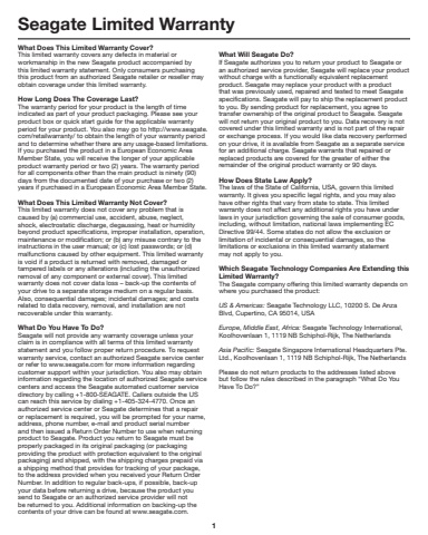 1Seagate Limited WarrantyWhat Does This Limited Warranty Cover? This limited warranty covers any defects in material or workmanship in the new Seagate product accompanied by this limited warranty statement. Only consumers purchasing this product from an authorized Seagate retailer or reseller may obtain coverage under this limited warranty.How Long Does The Coverage Last? The warranty period for your product is the length of time indicated as part of your product packaging. Please see your product box or quick start guide for the applicable warranty period for your product. You also may go to http://www.seagate.com/retailwarranty/ to obtain the length of your warranty period and to determine whether there are any usage-based limitations.If you purchased the product in a European Economic Area Member State, you will receive the longer of your applicable product warranty period or two (2) years. The warranty period for all components other than the main product is ninety (90) days from the documented date of your purchase or two (2) years if purchased in a European Economic Area Member State. What Does This Limited Warranty Not Cover? This limited warranty does not cover any problem that is caused by (a) commercial use, accident, abuse, neglect, shock, electrostatic discharge, degaussing, heat or humidity beyond product specifications, improper installation, operation, maintenance or modification; or (b) any misuse contrary to the instructions in the user manual; or (c) lost passwords; or (d) malfunctions caused by other equipment. This limited warranty is void if a product is returned with removed, damaged or tampered labels or any alterations (including the unauthorized removal of any component or external cover). This limited warranty does not cover data loss %u2013 back-up the contents of your drive to a separate storage medium on a regular basis.Also, consequential damages; incidental damages; and costs related to data recovery, removal, and installation are not recoverable under this warranty.What Do You Have To Do? Seagate will not provide any warranty coverage unless your claim is in compliance with all terms of this limited warranty statement and you follow proper return procedure. To request warranty service, contact an authorized Seagate service center or refer to www.seagate.com for more information regarding customer support within your jurisdiction. You also may obtain information regarding the location of authorized Seagate service centers and access the Seagate automated customer service directory by calling +1-800-SEAGATE. Callers outside the US can reach this service by dialing +1-405-324-4770. Once an authorized service center or Seagate determines that a repair or replacement is required, you will be prompted for your name, address, phone number, e-mail and product serial number and then issued a Return Order Number to use when returning product to Seagate. Product you return to Seagate must be properly packaged in its original packaging (or packaging providing the product with protection equivalent to the original packaging) and shipped, with the shipping charges prepaid via a shipping method that provides for tracking of your package, to the address provided when you received your Return Order Number. In addition to regular back-ups, if possible, back-up your data before returning a drive, because the product you send to Seagate or an authorized service provider will not be returned to you. Additional information on backing-up the contents of your drive can be found at www.seagate.com.What Will Seagate Do? If Seagate authorizes you to return your product to Seagate or an authorized service provider, Seagate will replace your product without charge with a functionally equivalent replacement product. Seagate may replace your product with a product that was previously used, repaired and tested to meet Seagate specifications. Seagate will pay to ship the replacement product to you. By sending product for replacement, you agree to transfer ownership of the original product to Seagate. Seagate will not return your original product to you. Data recovery is not covered under this limited warranty and is not part of the repair or exchange process. If you would like data recovery performed on your drive, it is available from Seagate as a separate service for an additional charge. Seagate warrants that repaired or replaced products are covered for the greater of either the remainder of the original product warranty or 90 days.How Does State Law Apply? The laws of the State of California, USA, govern this limited warranty. It gives you specific legal rights, and you may also have other rights that vary from state to state. This limited warranty does not affect any additional rights you have under laws in your jurisdiction governing the sale of consumer goods, including, without limitation, national laws implementing EC Directive 99/44. Some states do not allow the exclusion or limitation of incidental or consequential damages, so the limitations or exclusions in this limited warranty statement may not apply to you.Which Seagate Technology Companies Are Extending this Limited Warranty? The Seagate company offering this limited warranty depends on where you purchased the product: US & Americas: Seagate Technology LLC, 10200 S. De Anza Blvd, Cupertino, CA 95014, USAEurope, Middle East, Africa: Seagate Technology International, Koolhovenlaan 1, 1119 NB Schiphol-Rijk, The Netherlands Asia Pacific: Seagate Singapore International Headquarters Pte.Ltd., Koolhovenlaan 1, 1119 NB Schiphol-Rijk, The Netherlands Please do not return products to the addresses listed above but follow the rules described in the paragraph %u201cWhat Do You Have To Do?%u201d