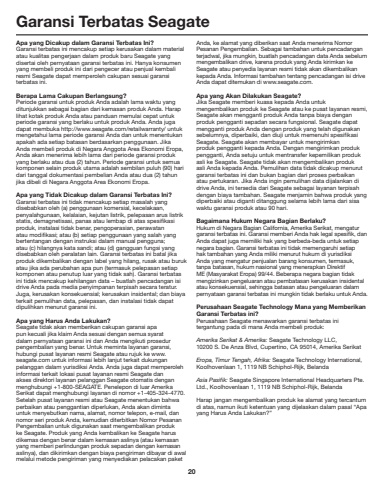 20Garansi Terbatas SeagateApa yang Dicakup dalam Garansi Terbatas Ini? Garansi terbatas ini mencakup setiap kerusakan dalam material atau kualitas pengerjaan dalam produk baru Seagate yang disertai oleh pernyataan garansi terbatas ini. Hanya konsumen yang membeli produk ini dari pengecer atau penjual kembali resmi Seagate dapat memperoleh cakupan sesuai garansi terbatas ini. Berapa Lama Cakupan Berlangsung? Periode garansi untuk produk Anda adalah lama waktu yang ditunjukkan sebagai bagian dari kemasan produk Anda. Harap lihat kotak produk Anda atau panduan memulai cepat untuk periode garansi yang berlaku untuk produk Anda. Anda juga dapat membuka http://www.seagate.com/retailwarranty/ untuk mengetahui lama periode garansi Anda dan untuk menentukan apakah ada setiap batasan berdasarkan penggunaan. Jika Anda membeli produk di Negara Anggota Area Ekonomi Eropa, Anda akan menerima lebih lama dari periode garansi produk yang berlaku atau dua (2) tahun. Periode garansi untuk semua komponen selain produk utama adalah sembilan puluh (90) hari dari tanggal dokumentasi pembelian Anda atau dua (2) tahun jika dibeli di Negara Anggota Area Ekonomi Eropa. Apa yang Tidak Dicakup dalam Garansi Terbatas Ini? Garansi terbatas ini tidak mencakup setiap masalah yang disebabkan oleh (a) penggunaan komersial, kecelakaan, penyalahgunaan, kelalaian, kejutan listrik, pelepasan arus listrik statis, demagnetisasi, panas atau lembap di atas spesifikasi produk, instalasi tidak benar, pengoperasian, perawatan atau modifikasi; atau (b) setiap penggunaan yang salah yang bertentangan dengan instruksi dalam manual pengguna; atau (c) hilangnya kata sandi; atau (d) gangguan fungsi yang disebabkan oleh peralatan lain. Garansi terbatas ini batal jika produk dikembalikan dengan label yang hilang, rusak atau buruk atau jika ada perubahan apa pun (termasuk pelepasan setiap komponen atau penutup luar yang tidak sah). Garansi terbatas ini tidak mencakup kehilangan data %u2013 buatlah pencadangan isi drive Anda pada media penyimpanan terpisah secara teratur.Juga, kerusakan konsekuensial; kerusakan insidental; dan biaya terkait pemulihan data, pelepasan, dan instalasi tidak dapat dipulihkan menurut garansi ini.Apa yang Harus Anda Lakukan? Seagate tidak akan memberikan cakupan garansi apa pun kecuali jika klaim Anda sesuai dengan semua syarat dalam pernyataan garansi ini dan Anda mengikuti prosedur pengembalian yang benar. Untuk meminta layanan garansi, hubungi pusat layanan resmi Seagate atau rujuk ke www.seagate.com untuk informasi lebih lanjut terkait dukungan pelanggan dalam yurisdiksi Anda. Anda juga dapat memperoleh informasi terkait lokasi pusat layanan resmi Seagate dan akses direktori layanan pelanggan Seagate otomatis dengan menghubungi +1-800-SEAGATE. Penelepon di luar Amerika Serikat dapat menghubungi layanan di nomor +1-405-324-4770.Setelah pusat layanan resmi atau Seagate menentukan bahwa perbaikan atau penggantian diperlukan, Anda akan diminta untuk menyebutkan nama, alamat, nomor telepon, e-mail, dan nomor seri produk Anda, kemudian diterbitkan Nomor Pesanan Pengembalian untuk digunakan saat mengembalikan produk ke Seagate. Produk yang Anda kembalikan ke Seagate harus dikemas dengan benar dalam kemasan aslinya (atau kemasan yang memberi perlindungan produk sepadan dengan kemasan aslinya), dan dikirimkan dengan biaya pengiriman dibayar di awal melalui metode pengiriman yang menyediakan pelacakan paket Anda, ke alamat yang diberikan saat Anda menerima Nomor Pesanan Pengembalian. Sebagai tambahan untuk pencadangan terjadwal, jika mungkin, buatlah pencadangan data Anda sebelum mengembalikan drive, karena produk yang Anda kirimkan ke Seagate atau penyedia layanan resmi tidak akan dikembalikan kepada Anda. Informasi tambahan tentang pencadangan isi drive Anda dapat ditemukan di www.seagate.com.Apa yang Akan Dilakukan Seagate? Jika Seagate memberi kuasa kepada Anda untuk mengembalikan produk ke Seagate atau ke pusat layanan resmi, Seagate akan mengganti produk Anda tanpa biaya dengan produk pengganti sepadan secara fungsional. Seagate dapat mengganti produk Anda dengan produk yang telah digunakan sebelumnya, diperbaiki, dan diuji untuk memenuhi spesifikasi Seagate. Seagate akan membayar untuk mengirimkan produk pengganti kepada Anda. Dengan mengirimkan produk pengganti, Anda setuju untuk mentransfer kepemilikan produk asli ke Seagate. Seagate tidak akan mengembalikan produk asli Anda kepada Anda. Pemulihan data tidak dicakup menurut garansi terbatas ini dan bukan bagian dari proses perbaikan atau pertukaran. Jika Anda ingin pemulihan data dijalankan di drive Anda, ini tersedia dari Seagate sebagai layanan terpisah dengan biaya tambahan. Seagate menjamin bahwa produk yang diperbaiki atau diganti ditanggung selama lebih lama dari sisa waktu garansi produk atau 90 hari.Bagaimana Hukum Negara Bagian Berlaku? Hukum di Negara Bagian California, Amerika Serikat, mengatur garansi terbatas ini. Garansi memberi Anda hak legal spesifik, dan Anda dapat juga memiliki hak yang berbeda-beda untuk setiap negara bagian. Garansi terbatas ini tidak memengaruhi setiap hak tambahan yang Anda miliki menurut hukum di yurisdiksi Anda yang mengatur penjualan barang konsumen, termasuk, tanpa batasan, hukum nasional yang menerapkan Direktif ME (Masyarakat Eropa) 99/44. Beberapa negara bagian tidak mengizinkan pengeluaran atau pembatasan kerusakan insidental atau konsekuensial, sehingga batasan atau pengeluaran dalam pernyataan garansi terbatas ini mungkin tidak berlaku untuk Anda.Perusahaan Seagate Technology Mana yang Memberikan Garansi Terbatas ini? Perusahaan Seagate menawarkan garansi terbatas ini tergantung pada di mana Anda membeli produk: Amerika Serikat & Amerika: Seagate Technology LLC, 10200 S. De Anza Blvd, Cupertino, CA 95014, Amerika SerikatEropa, Timur Tengah, Afrika: Seagate Technology International, Koolhovenlaan 1, 1119 NB Schiphol-Rijk, BelandaAsia Pasifik: Seagate Singapore International Headquarters Pte.Ltd., Koolhovenlaan 1, 111