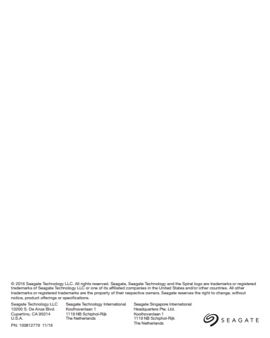 %u00a9 2016 Seagate Technology LLC. All rights reserved. Seagate, Seagate Technology and the Spiral logo are trademarks or registered trademarks of Seagate Technology LLC or one of its affiliated companies in the United States and/or other countries. All other trademarks or registered trademarks are the property of their respective owners. Seagate reserves the right to change, without notice, product offerings or specifications.Seagate Technology LLC10200 S. De Anza Blvd.Cupertino, CA 95014U.S.A.PN: 100812779 11/16Seagate Technology InternationalKoolhovenlaan 11119 NB Schiphol-RijkThe NetherlandsSeagate Singapore International Headquarters Pte. Ltd.Koolhovenlaan 11119 NB Schiphol-RijkThe Netherlands