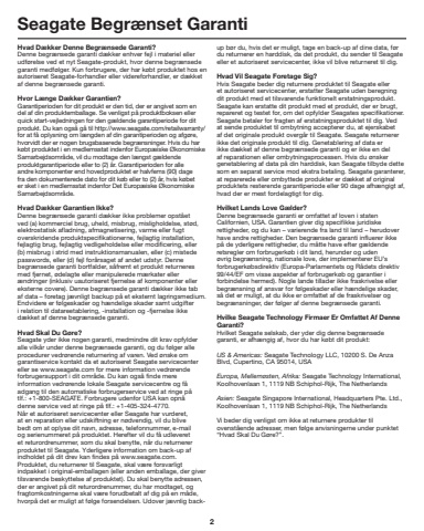 2Seagate Begr%u00e6nset GarantiHvad D%u00e6kker Denne Begr%u00e6nsede Garanti?Denne begr%u00e6nsede garanti d%u00e6kker enhver fejl i materiel eller udf%u00f8relse ved et nyt Seagate-produkt, hvor denne begr%u00e6nsede garanti medf%u00f8lger. Kun forbrugere, der har k%u00f8bt produktet hos en autoriseret Seagate-forhandler eller videreforhandler, er d%u00e6kket af denne begr%u00e6nsede garanti.Hvor L%u00e6nge D%u00e6kker Garantien?Garantiperioden for dit produkt er den tid, der er angivet som en del af din produktemballage. Se venligst p%u00e5 produktboksen eller quick start-vejledningen for den g%u00e6ldende garantiperiode for dit produkt. Du kan ogs%u00e5 g%u00e5 til http://www.seagate.com/retailwarranty/ for at f%u00e5 oplysning om l%u00e6ngden af din garantiperioden og afg%u00f8re, hvorvidt der er nogen brugsbaserede begr%u00e6nsninger. Hvis du har k%u00f8bt produktet i en medlemsstat indenfor Europ%u00e6iske %u00d8konomiske Samarbejdsomr%u00e5de, vil du modtage den l%u00e6ngst g%u00e6ldende produktgarantiperiode eller to (2) %u00e5r. Garantiperioden for alle andre komponenter end hovedproduktet er halvfems (90) dage fra den dokumenterede dato for dit k%u00f8b eller to (2) %u00e5r, hvis k%u00f8bet er sket i en medlemsstat indenfor Det Europ%u00e6iske %u00d8konomiske Samarbejdsomr%u00e5de.Hvad D%u00e6kker Garantien Ikke?Denne begr%u00e6nsede garanti d%u00e6kker ikke problemer opst%u00e5et ved (a) kommerciel brug, uheld, misbrug, misligholdelse, st%u00f8d, elektrostatisk afladning, afmagnetisering, varme eller fugt overskridende produktspecifikationerne, fejlagtig installation, fejlagtig brug, fejlagtig vedligeholdelse eller modificering, eller (b) misbrug i strid med instruktionsmanualen, eller (c) mistede passwords, eller (d) fejl for%u00e5rsaget af andet udstyr. Denne begr%u00e6nsede garanti bortfalder, s%u00e5fremt et produkt returneres med fjernet, %u00f8delagte eller manipulerede m%u00e6rkater eller %u00e6ndringer (inklusiv uautoriseret fjernelse af komponenter eller eksterne covere). Denne begr%u00e6nsede garanti d%u00e6kker ikke tab af data %u2013 foretag j%u00e6vnligt backup p%u00e5 et eksternt lagringsmedium.Endvidere er f%u00f8lgeskader og h%u00e6ndelige skader samt udgifter i relation til datareetablering, -installation og -fjernelse ikke d%u00e6kket af denne begr%u00e6nsede garanti.Hvad Skal Du G%u00f8re?Seagate yder ikke nogen garanti, medmindre dit krav opfylder alle vilk%u00e5r under denne begr%u00e6nsede garanti, og du f%u00f8lger alle procedurer vedr%u00f8rende returnering af varen. Ved %u00f8nske om garantiservice kontakt da et autoriseret Seagate servicecenter eller se www.seagate.com for mere information vedr%u00f8rende forbrugersupport i dit omr%u00e5de. Du kan ogs%u00e5 finde mere information vedr%u00f8rende lokale Seagate servicecentre og f%u00e5 adgang til den automatiske forbrugerservice ved at ringe p%u00e5 tlf.: +1-800-SEAGATE. Forbrugere udenfor USA kan opn%u00e5 denne service ved at ringe p%u00e5 tlf.: +1-405-324-4770.N%u00e5r et autoriseret servicecenter eller Seagate har vurderet, at en reparation eller udskiftning er n%u00f8dvendig, vil du blive bedt om at oplyse dit navn, adresse, telefonnummer, e-mail og serienummeret p%u00e5 produktet. Herefter vil du f%u00e5 udleveret et returordrenummer, som du skal benytte, n%u00e5r du returnerer produktet til Seagate. Yderligere information om back-up af indholdet p%u00e5 dit drev kan findes p%u00e5 www.seagate.com.Produktet, du returnerer til Seagate, skal v%u00e6re forsvarligt indpakket i original-emballagen (eller anden emballage, der giver tilsvarende beskyttelse af produktet). Du skal benytte adressen, der er angivet p%u00e5 dit returordrenummer, du har modtaget, og fragtomkostningerne skal v%u00e6re forudbetalt af dig p%u00e5 en m%u00e5de, hvorp%u00e5 det er muligt at f%u00f8lge forsendelsen. Udover j%u00e6vnlig backup b%u00f8r du, hvis det er muligt, tage en back-up af dine data, f%u00f8r du returnerer en harddisk, da det produkt, du sender til Seagate eller et autoriseret servicecenter, ikke vil blive returneret til dig.Hvad Vil Seagate Foretage Sig?Hvis Seagate beder dig returnere produktet til Seagate eller et autoriseret servicecenter, erstatter Seagate uden beregning dit produkt med et tilsvarende funktionelt erstatningsprodukt.Seagate kan erstatte dit produkt med et produkt, der er brugt, repareret og testet for, om det opfylder Seagates specifikationer.Seagate betaler for fragten af erstatningsproduktet til dig. Ved at sende produktet til ombytning accepterer du, at ejerskabet af det originale produkt overg%u00e5r til Seagate. Seagate returnerer ikke det originale produkt til dig. Genetablering af data er ikke d%u00e6kket af denne begr%u00e6nsede garanti og er ikke en del af reparationen eller ombytningsprocessen. Hvis du %u00f8nsker genetablering af data p%u00e5 din harddisk, kan Seagate tilbyde dette som en separat service mod ekstra betaling. Seagate garanterer, at reparerede eller ombyttede produkter er d%u00e6kket af original produktets resterende garantiperiode eller 90 dage afh%u00e6ngigt af, hvad der er mest fordelagtigt for dig.Hvilket Lands Love G%u00e6lder?Denne begr%u00e6nsede garanti er omfattet af loven i staten Californien, USA. Garantien giver dig specifikke juridiske rettigheder, og du kan %u2013 varierende fra land til land %u2013 herudover have andre rettigheder. Den begr%u00e6nsede garanti influerer ikke p%u00e5 de yderligere rettigheder, du m%u00e5tte have efter g%u00e6ldende retsregler om forbrugerk%u00f8b i dit land, herunder og uden %u00f8vrig begr%u00e6nsning, nationale love, der implementerer EU%u2019s forbrugerk%u00f8bsdirektiv (Europa-Parlamentets og R%u00e5dets direktiv 99/44/EF om visse aspekter af forbrugerk%u00f8b og garantier i forbindelse hermed). Nogle lande tillader ikke fraskrivelse eller begr%u00e6nsning af ansvar for f%u00f8lgeskader eller h%u00e6ndelige skader, s%u00e5 det er muligt, at du ikke er omfattet af de fraskrivelser og begr%u00e6nsninger, der f%u00f8