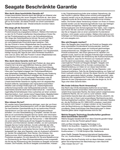 3Seagate Beschr%u00e4nkte GarantieWas deckt diese beschr%u00e4nkte Garantie ab? Unsere beschr%u00e4nkte Garantie deckt alle M%u00e4ngel am Material oder an der Verarbeitung des neuen Seagate-Produkts ab, dem diese beschr%u00e4nkte Garantieerkl%u00e4rung beiliegt. Diese beschr%u00e4nkte Garantie gilt nur f%u00fcr Kunden, die dieses Produkt von einem autorisierten Seagate-Einzelh%u00e4ndler oder -Wiederverk%u00e4ufer erworben haben.Wie lange gilt die Garantie? Die Garantiedauer f%u00fcr dieses Produkt ist der auf der Produktverpackung angegebene Zeitraum. Weitere Informationen zu dem f%u00fcr Ihr Produkt zutreffenden Garantiezeitraum finden Sie auf der Produktverpackung oder in der Schnellstartanleitung.Die L%u00e4nge des Garantiezeitraums k%u00f6nnen Sie auch auf http://www.seagate.com/retailwarranty/ abrufen und ermitteln, ob nuztungsbedingte Einschr%u00e4nkungen bestehen. Falls Sie das Produkt in einem Mitgliedsstaat des Europ%u00e4ischen Wirtschaftsraums erworben haben, erhalten Sie den l%u00e4ngeren zutreffende Produktgarantiezeitraum oder zwei (2) Jahre. Der Garantiezeitraum f%u00fcr Komponenten, abgesehen vom Hauptprodukt, betr%u00e4gt neunzig (90) Tage ab dem dokumentierten Kaufdatum oder zwei (2) Jahre, falls das Produkt in einem Mitgliedsstaat des Europ%u00e4ischen Wirtschaftsraums erworben wurde.Was deckt diese Garantie nicht ab? Unsere beschr%u00e4nkte Garantie deckt kein Problem ab, dass seine Ursache hat in (a) einer gesch%u00e4ftlichen Nutzung, einem Unfall, einem Missbrauch, einer Pflichtverletzung, einer Ersch%u00fctterung, einer elektrostatischen Entladung, Entmagnetisierung, %u00fcberm%u00e4%u00dfiger Hitze oder Feuchtigkeit entgegen den Produktspezifikationen, einer fehlerhaften Installation, Bedienung, Wartung oder %u00c4nderung oder (b) einem falschen Gebrauch entgegen den Anweisungen im Nutzerhandbuch oder (c) verlorenen Passw%u00f6rtern oder (d) Fehlfunktionen, die von anderen Ger%u00e4ten verursacht wurden.Unsere beschr%u00e4nkte Garantie ist ung%u00fcltig wenn ein eingesandtes Produkt entfernte, besch%u00e4digte oder manipulierte Aufschriften/Etiketten oder sonstige %u00c4nderungen (z.B. unberechtigterweise entfernte Komponenten oder Geh%u00e4usedeckel) aufweist. Unsere beschr%u00e4nkte Garantie deckt keinen Datenverlust ab %u2013 machen Sie regelm%u00e4%u00dfig Sicherheitskopien ihres Laufwerkes auf einem anderen Speichermedium. Auch werden keine Folgesch%u00e4den, Begleitsch%u00e4den und mit der Wiederherstellung von Daten, dem Ausbau und der Installation verbundene Kosten im Rahmen unserer Garantie ersetzt.Was m%u00fcssen Sie tun? Wir werden keine Garantieleistung erbringen, wenn der von Ihnen geltend gemachte Garantieanspruch nicht mit allen Bedingungen der beschr%u00e4nkten Garantieerkl%u00e4rung f%u00fcr ein bestimmtes Produkt %u00fcbereinstimmt und Sie nicht das richtige R%u00fcckgabeverfahren einhalten. Um eine Garantieleistung zu erhalten, wenden Sie sich bitte an ein autorisiertes Seagate Service Center oder informieren Sie sich unter www.seagate.com %u00fcber den Kundenservice in ihrem Land. Sie k%u00f6nnen zudem unter der Rufnummer +1-800-SEAGATE die automatische Telefonauskunft des Seagate Kundenservice erreichen und Informationen dar%u00fcber erhalten, wo sich autorisierte Seagate Service Center befinden. Anrufer au%u00dferhalb der USA k%u00f6nnen diese Auskunft unter der Rufnummer +1-405-324-4770 erreichen. Sobald ein autorisiertes Service Center oder Seagate festgestellt hat, dass eine Reparatur oder ein Austausch erforderlich ist, werden Sie aufgefordert, Ihren Namen, Ihre Adresse, Ihre Telefonnummer, Ihre Emailadresse und die Seriennummer des Produktes anzugeben. Es wird daraufhin f%u00fcr Sie eine Bestellnummer zur R%u00fccksendung der Ware (R%u00fccksendebestellnummer) ausgestellt, die Sie bei der R%u00fccksendung des Produktes an Seagate verwenden m%u00fcssen. Die Produkte, die Sie an Seagate zur%u00fccksenden, m%u00fcssen in der Originalverpackung (oder einer anderen Verpackung, die das Produkt in gleicher Weise sicher sch%u00fctzt) ordnungsgem%u00e4%u00df verpackt werden und an die Adresse versandt werden, die Ihnen mitgeteilt wurde als Sie die R%u00fccksendebestellnummer erhalten haben. Die Kosten dieser Versendung m%u00fcssen von Ihnen im Voraus bezahlt werden und die Versendungsmethode muss das Verfolgen Ihres Pakets erm%u00f6glichen. Machen Sie neben regelm%u00e4%u00dfigen Sicherungskopien eine Sicherungskopie Ihrer Daten, wenn m%u00f6glich, auch bevor Sie das Laufwerk zur%u00fcckgeben, da Sie das Produkt, das Sie an Seagate oder an einen autorisierten Kundendienst schicken, nicht wieder zur%u00fcck erhalten. Weitere Informationen zum Anfertigen von Sicherungskopien Ihres Laufwerksinhalts finden Sie auf www.seagate.com.Was wird Seagate machen?Wenn Sie Seagate dazu berechtigt, ein Produkt an Seagate oder einen autorisierten Kundendienst zur%u00fcckzusenden, tauschen wir Ihr Produkt kostenlos gegen ein funktionell gleichwertiges Austauschprodukt aus. Seagate kann Ihr Produkt gegen ein Produkt austauschen, das schon gebraucht ist, repariert und getestet wurde, damit es den Seagate Anforderungen entspricht.Seagate tr%u00e4gt die Kosten der Versendung des Austauschprodukts an Sie. Dadurch, dass Sie Ihr Produkt zum Austausch senden, sind Sie damit einverstanden, dass das Eigentum an dem urspr%u00fcnglichen Produkt auf Seagate %u00fcbergeht. Seagate wird urspr%u00fcngliche Produkte nicht an Kunden zur%u00fccksenden. Die Wiederherstellung von Daten ist von dieser beschr%u00e4nkten Garantie nicht abgedeckt und ist nicht Teil des Reparatur- oder Austauschverfahrens. Falls Sie die Wiederherstellung von Daten auf Ihrem Laufwerk w%u00fcnschen, k%u00f6nnen Sie diesen Service von Seagate gegen eine gesonderte Geb%u00fchr erhalten. Seagate garantiert, dass reparierte oder ausgetauschte Produkte f%u00fcr die %u00fcbrige Laufzeit der Garantie f%u00fcr das Originalprodukt oder, falls dies l%u00e4nger ist, f%u00fcr 90 Tage unter diese Garantie fallen.Wie fi